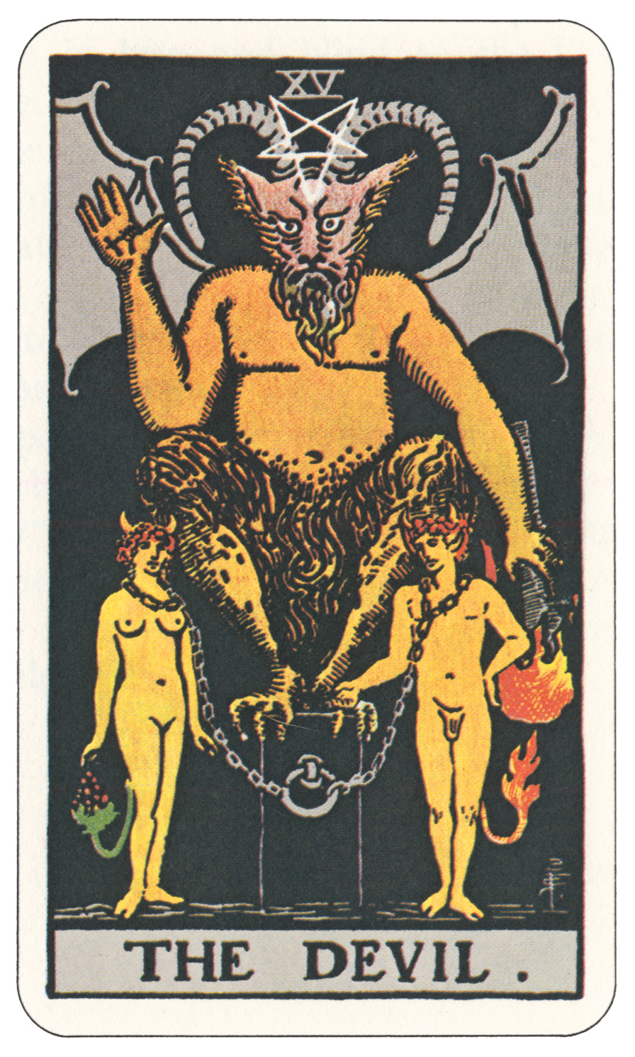So, maybe there’s too much of a good thing going on here? Got some destructive fantasies whirring in the brain? Addictive behavior, anyone? Sometimes not making a choice is as bad as making the wrong one. If we make a choice, then we have to live with the ramifications of that decision. Emotional blocks sabotage progress. This combination can indicate a very deep form of self-sabotage that’s often unconscious. We’re controlled by irrational forces, operating as a puppet on a string. Here’s where we’re obsessed and can’t see beyond our own desires. If we con’t make a choice we’ll just sit and stagnate, no progress will be made. Devotion to unhealthy obsessions. Sexual slavery or addiction. Something needs to be brought to light (see the Sabian Symbol, above). Drowning our shame or self-hatred in excess. Fear of change. Choosing to be a scapegoat or the focus of someone else’s projections. The 7 of Cups relates to the Moon in Scorpio and the Devil connects with Capricorn, so this combination tells us it’s time to get to the root of the problem. There are also 7 Deadly Sins, aren’t there? The Not-So-Lucky Seven. A fearless exploration of our complexes, hang-ups and blockages is necessary now. Shine a light in the darkness. It may be easier to access and unleash this material through music, art, film, literature, or other creative activities. Let it out, write it down, explore myths both ancient and modern. Other people may not be aware of what’s going on, and may not understand that sometimes you have to crawl through the darkness to find the light. Don’t lose your sense of humor–this combination can also show a keen satirical sensibility with a great understanding for the weaknesses and foibles of humanity.